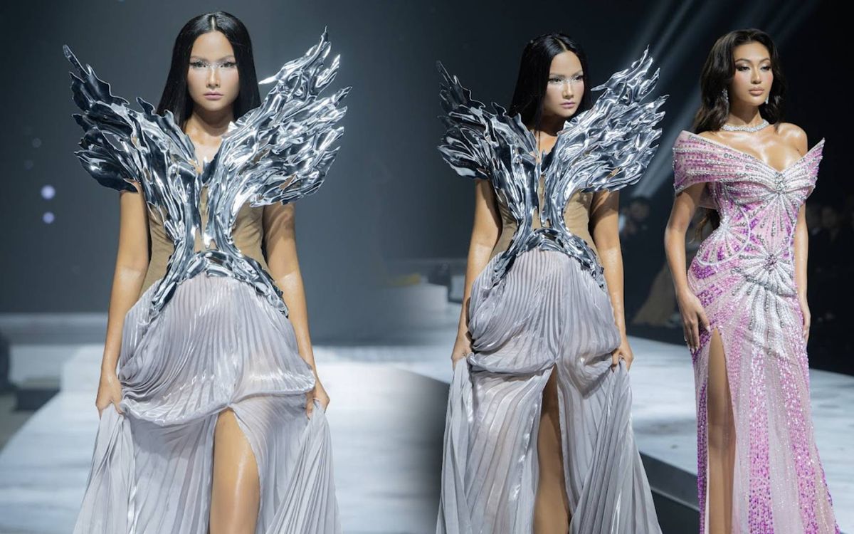 Hoa hậu Khánh Vân đảm nhiệm vị trí vedette cho BST. Nàng hậu khoác lên người bộ cánh lông vũ, dài quét đây. Thiết kế này thường gây khó khăn trong việc trình diễn. Tuy nhiên, Hoa hậu Khánh Vân đã dễ dàng vượt qua. Không chỉ xử lý chiếc váy mượt mà, nàng hậu còn ghi điểm với thần thái sắc lạnh cùng những bước đi chắc chắn.