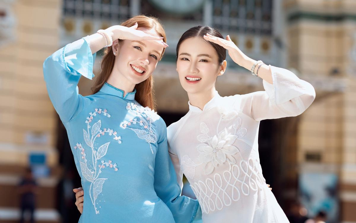 Miss World Scotland 2024 cũng vô cùng tinh tế. Cô khiến Ý Nhi bất ngờ khi xuất hiện trong chiếc áo dài cách tân ngay lần đầu gặp gỡ và mang theo nhiều quà tặng độc đáo. Diện trên người bộ trang phục truyền thống Việt Nam, hai nàng hậu khoe sắc mười phân vẹn mười.