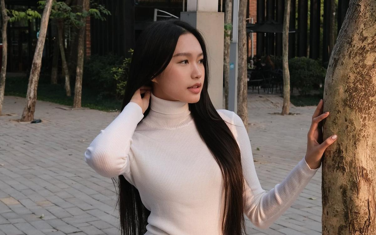 Vào ngày mùng 2 Tết, Doãn Hải My khoác lên mình tà áo dài truyền thống mang sắc hồng phấn và xanh pastel điểm xuyết hoa văn mềm mại, tạo nên vẻ ngoài dịu dàng, yêu kiều. Nét cắt may tinh tế, ôm nhẹ dáng người, kết hợp với phần tay áo lửng bồng bềnh, tôn lên vóc dáng thanh thoát của cô. Mái tóc đen buông xõa tự nhiên càng làm nổi bật vẻ đẹp thuần khiết, ngọt ngào.