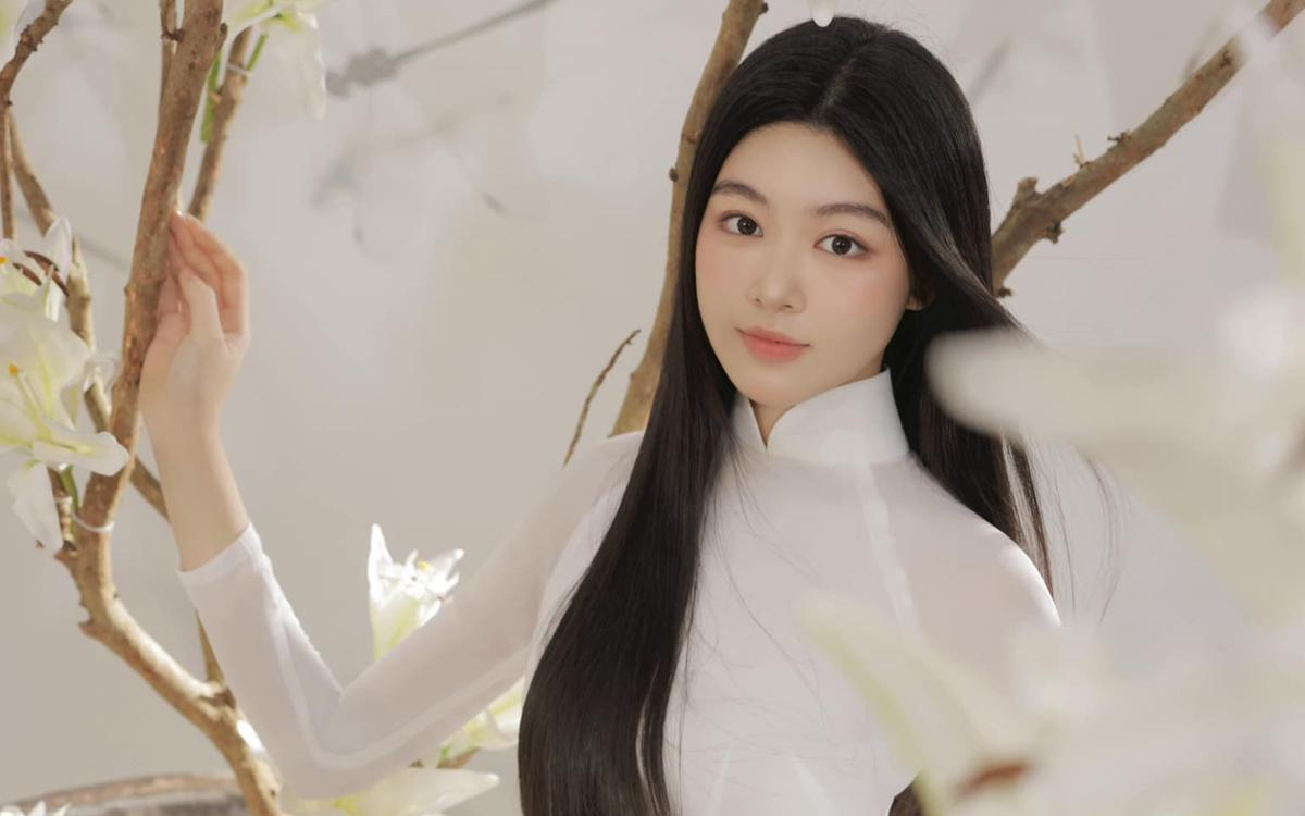 Chiếc áo dài trắng mà con gái Quyền Linh diện được thiết kế tối giản nhưng đầy tinh tế, vừa kín đáo, vừa tôn lên vóc dáng thon gọn. Sự đồng điệu giữa trang phục và bối cảnh hoa ly trắng đã tạo nên một tổng thể hài hòa, mang đậm chất nghệ thuật.