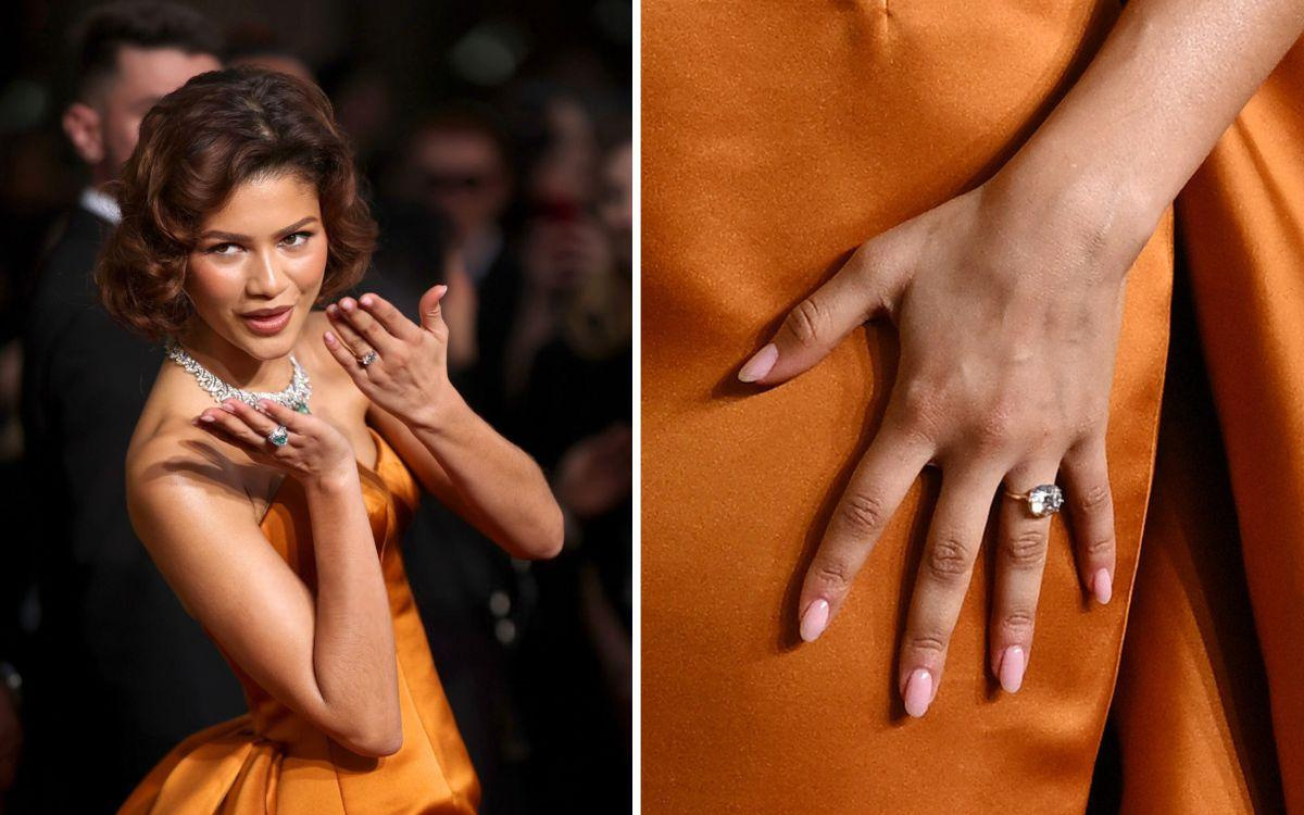 Trong sự kiện Quả Cầu Vàng 2025, Zendaya chính thức ra mắt chiếc nhẫn cầu hôn tuyệt đẹp do bạn trai Tom Holland chọn. Cô chọn kiểu móng nude tự nhiên với độ dài vừa phải, đầu móng bo tròn nhẹ, tạo sự thanh thoát để tôn lên viên kim cương cushion cut (hình đệm) gắn ngang trên dải nhẫn vàng mảnh mai. Bộ móng tinh giản này kết hợp hoàn hảo với vẻ sang trọng và hiện đại của chiếc nhẫn.