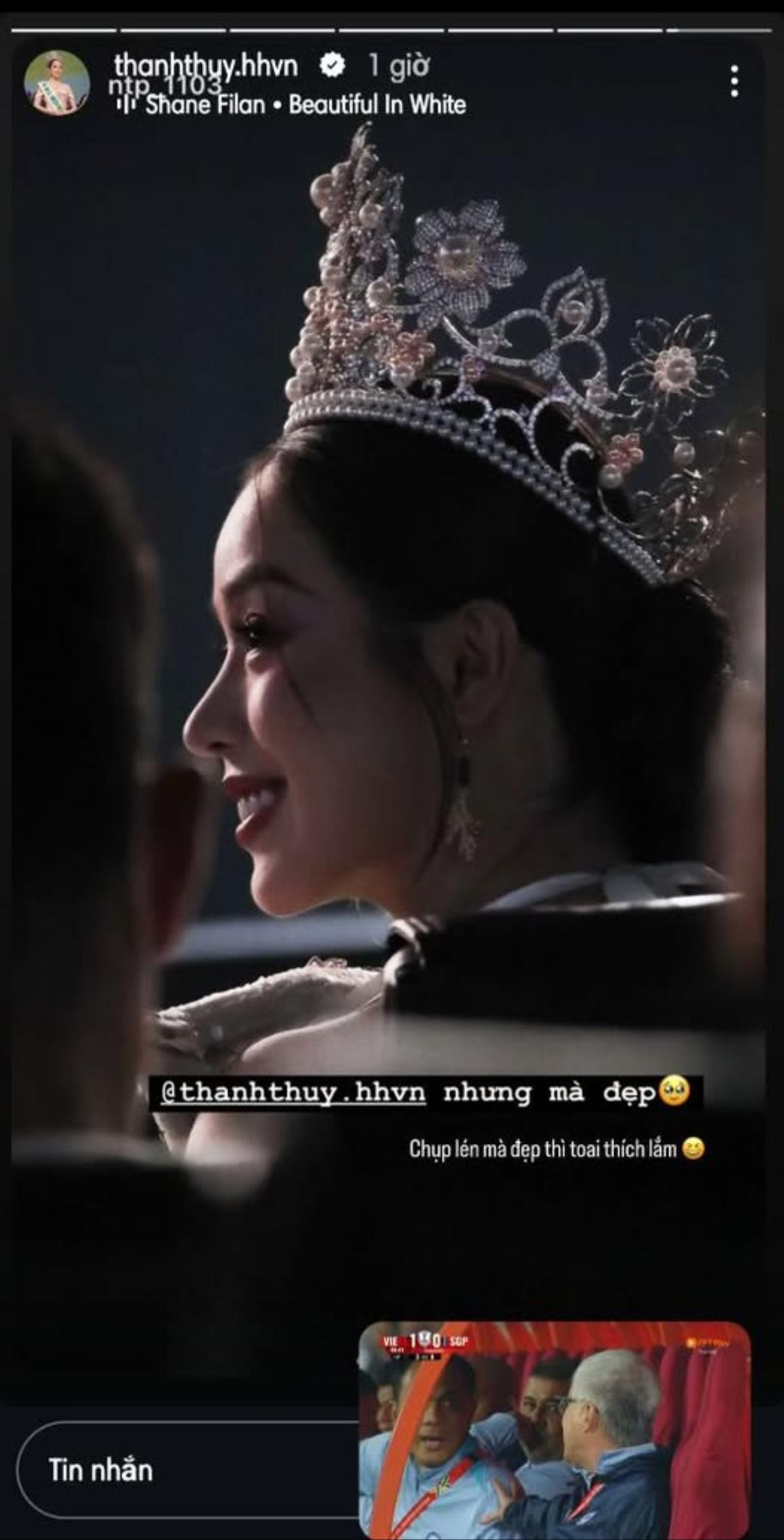 Bức ảnh ngay lập tức nhận được sự yêu thích từ đông đảo người hâm mộ. Trong khung hình, Hoa hậu Thanh Thủy khoe góc nghiêng hoàn hảo với sóng mũi cao, ngũ quan hài hòa và thần thái cuốn hút. Vẻ đẹp nhẹ nhàng nhưng không kém phần quyến rũ của cô khiến người hâm mộ không khỏi trầm trồ.
