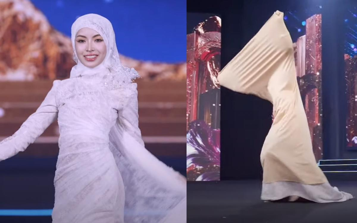 Trong đó, màn xuất hiện của đại diện Maha Sarakham lại bất ngờ được nhắc đến nhiều. Người đẹp gây chú ý khi quấn khăn từ đầu tới chân, che kín cả gương mặt. Đại diện Maha Sarakham xoay tròn người nhiều lần trong lúc trình diễn, tương tự như lốc xoáy và thực hiện động tác thay đồ ngay trên sân khấu.
