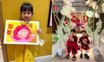 Hai con Cường Đô La diện áo dài chụp ảnh Tết.