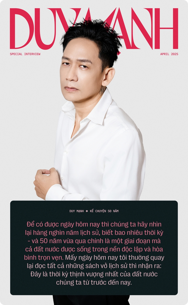 Tôi thấy mỗi ngày trôi qua đều vui. Đặc biệt tuổi 50 năm nay cũng đúng vào dịp tròn 50 Giải phóng miền Nam, thống nhất đất nước. Tôi sinh ngày 22/05/1975, chỉ ngay sau khi đất nước thống nhất thôi. Vậy nên với tôi thì đó cũng là một năm mà tôi cảm thấy nhiều niềm vui và may mắn. Để có được ngày hôm nay thì chúng ta hãy nhìn lại hàng nghìn năm lịch sử, biết bao nhiêu thời kỳ – và 50 năm vừa qua chính là một giai đoạn mà cả đất nước được sống trong nền độc lập và hòa bình trọn vẹn. Mấy ngày hôm nay tôi thường quay lại đọc tất cả những sách vở lịch sử thì nhận ra: Đây là thời kỳ thịnh vượng nhất của đất nước chúng ta từ trước đến nay.