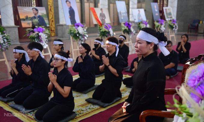Con gái lớn của Ngọc Tiền ngồi hàng đầu, đeo kính trong đám tang ba dượng.