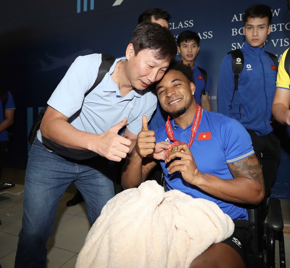 HLV Kim Sang-sik và Xuân Son tại sân bay Thái Lan. Anh bị chấn thương nặng sắp phải phẫu thuật