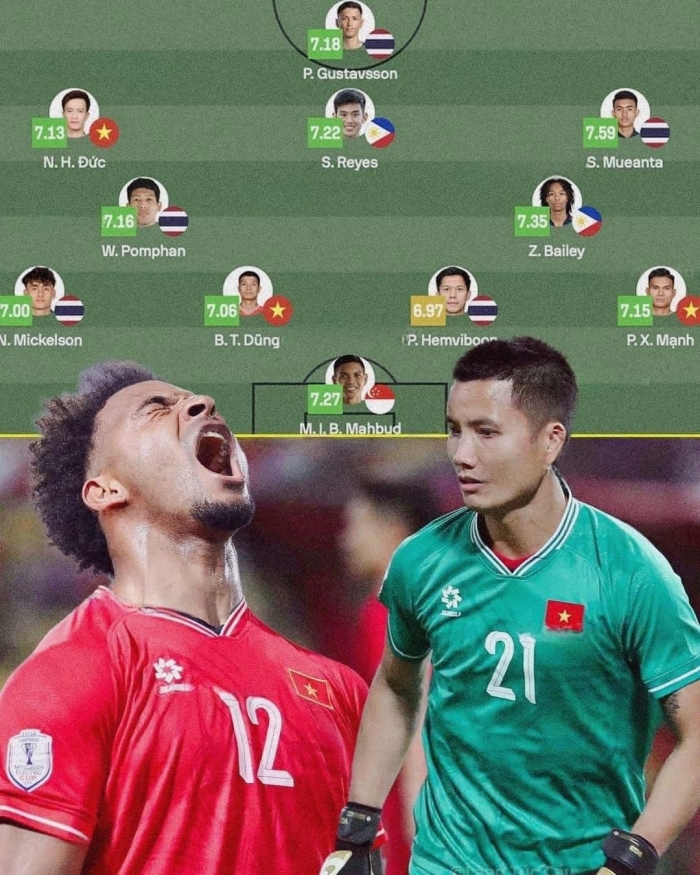 Thậm chí, dù giành chức vô địch nhưng ĐT Việt Nam chỉ đóng góp 3 gương mặt trong ĐHTB gồm tiền vệ Hoàng Đức (7.13), trung vệ Tiến Dũng (7.06), Xuân Mạnh (7.15). Trong khi đó, đội Á quân Thái Lan lại chiếm tới 5 cầu thủ gồm hậu vệ Mickelson, trung vệ Pansa Hemviboon, tiền vệ Weerathep và tiền vệ Suphanat.
