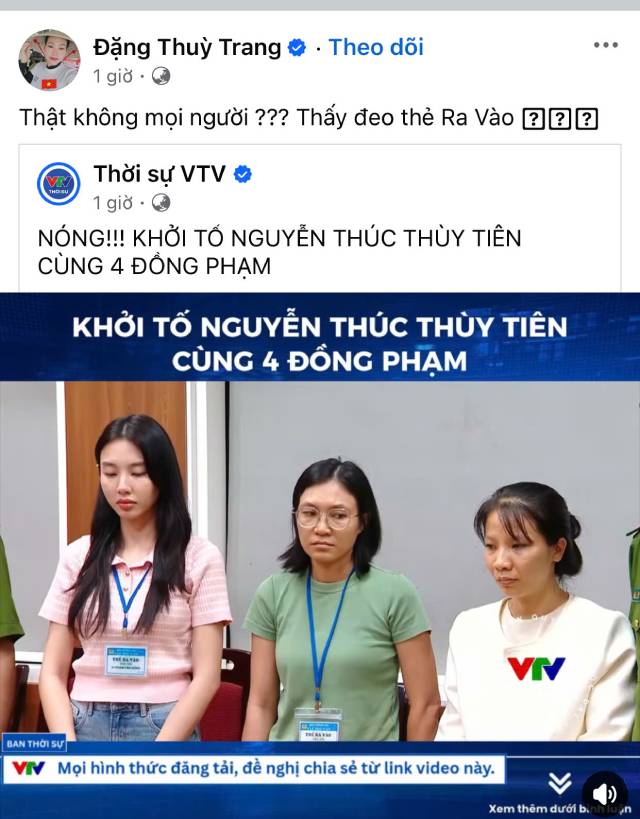 “Chủ nợ” của Thùy Tiên đã đăng tải dòng trạng thái vào tối ngày hôm qua 19/5 với nội dung ngắn gọn: “Thật không mọi người? Thấy đeo thẻ ra vào?”. Dòng trạng thái đi kèm bài viết được chia sẻ từ fanpage “Thời sự VTV” có hình ảnh Thùy Tiên bị cơ quan chức năng bắt tạm giam và chính thức khởi tố.
