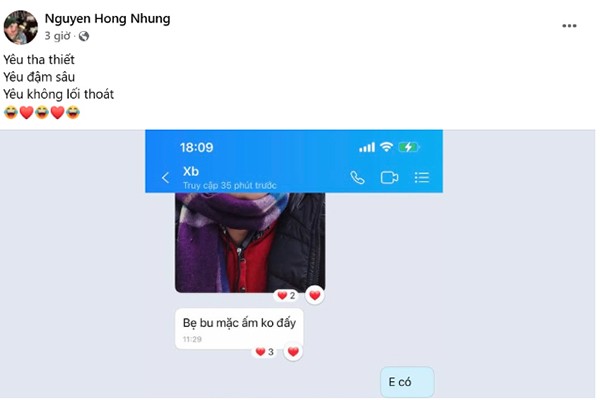 Cùng với việc đưa hình ảnh tin nhắn, vợ NSND Xuân Bắc còn chia sẻ dòng trạng thái: “Yêu tha thiết, yêu đậm sâu, yêu không lối thoát”.