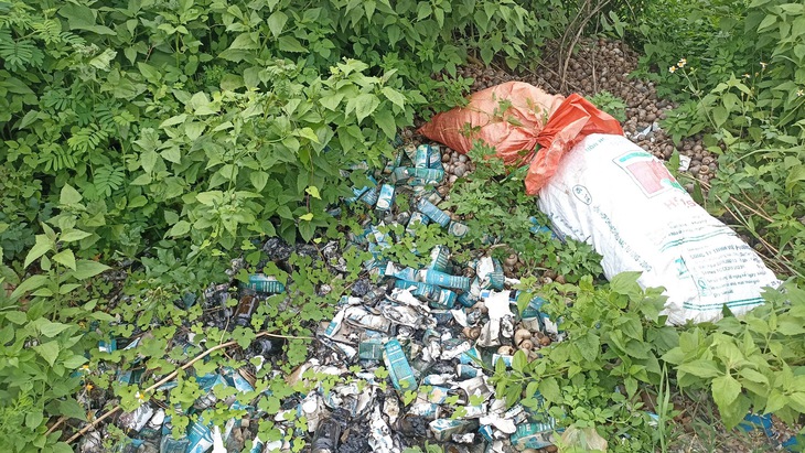 Nơi người dân phát hiện cách ngôi nhà của Lê Văn Hải (29 tuổi, xã Văn Phú, huyện Nho Quan) – chủ tài khoản TikTok “Gia đình Hải Sen” – khoảng gần 800m. Nhiều sản phẩm như sâm tố nữ Hải Sen, xịt xoang Hải Sen bị vứt bỏ, đốt nham nhở.