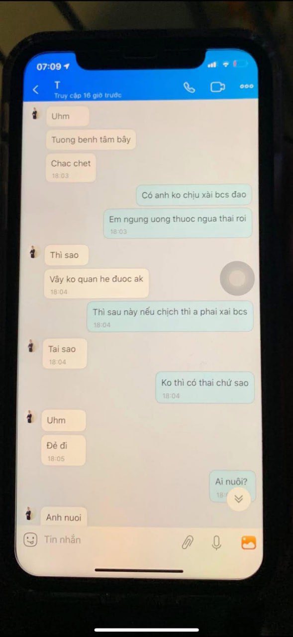 Có thể là hình ảnh về điện thoại và văn bản cho biết '07:09 T cAp 6g trước Uhm 00O Tuongbenhtâmbây Tuong benh tâm bây Chac Chacchet chet 18:03 Có anh ko chịu xài bcs đao Em ngung uong thuoc ngua thai roi 18:03 Thì sao Vây ko quan he đuoc ak 18:04 Thì sau này nếu chịch thì 18:04 phai xai bcs Tai sao 18:04 Ko thì có thai chứ sao 18:04 Uhm Để đi 18:05 Ai nuôi? Anh nuoi Tin nhắn 0'