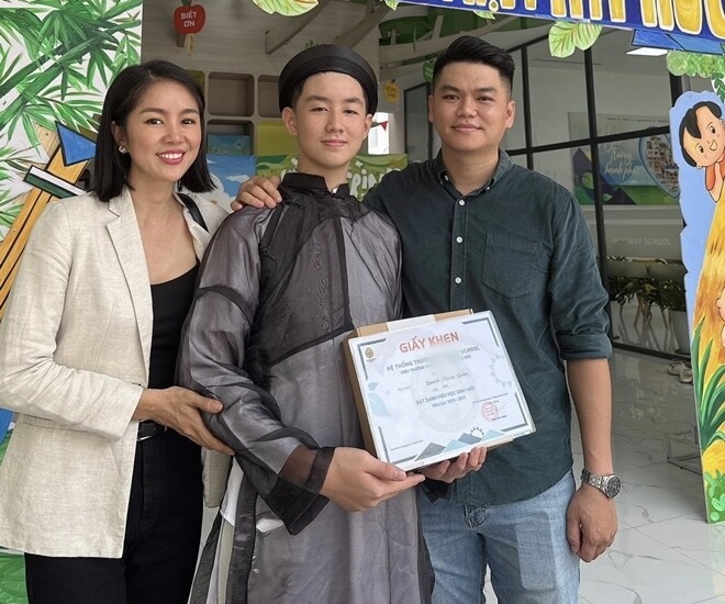 Cô chia sẻ trên trang cá nhân: “Hôm nay Lễ Tổng kết – lớp 7, anh hai tích cực tham gia văn nghệ và đạt danh hiệu Học sinh Giỏi. Ba mẹ biết con đã rất nỗ lực. Chúc mừng con! Yêu con thật nhiều!”.