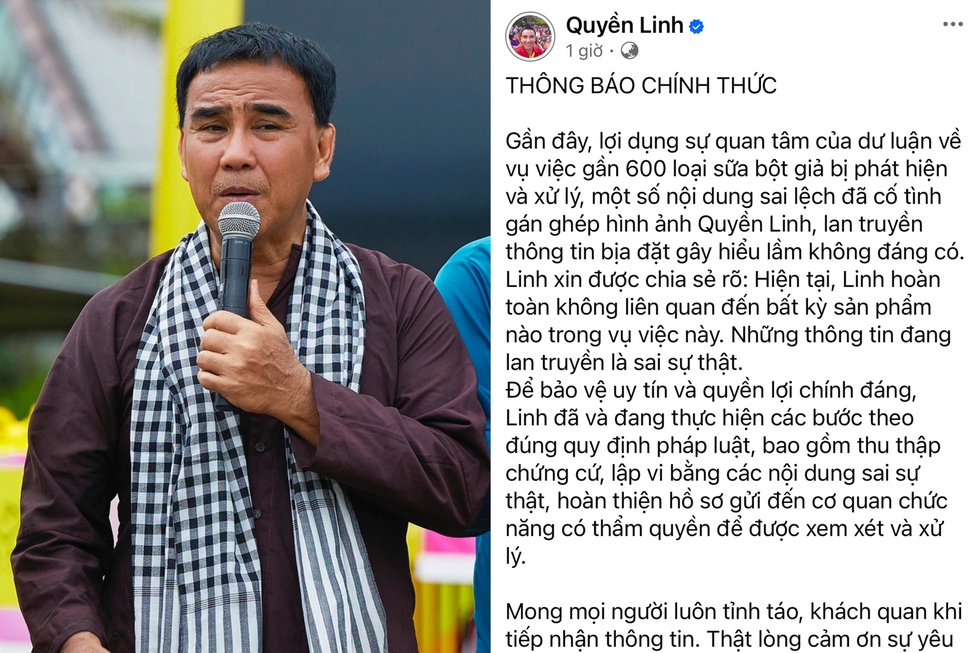 Thông qua fanpage hơn 2,4 triệu người theo dõi, Quyền Linh đăng tải bài viết làm rõ về ồn ào quảng cáo sữa. Nam MC cho biết khi vụ việc gần 600 loại sữa bột giả bị phát hiện và xử lý, đã xuất hiện một số nội dung sai lệch, cố tình gán ghép hình ảnh của anh, lan truyền thông tin gây hiểu lầm.