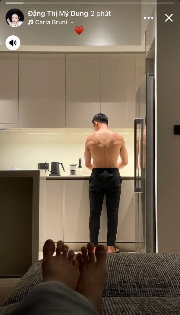 Trong khoảnh khắc này, Midu đang thư giãn ở sofa còn thiếu gia Minh Đạt đứng quay lưng về phía vợ, chăm chú làm gì đó ở bếp. Từ đây, nữ giảng viên khoe khéo bóng lưng vạm vỡ, săn chắc của ông xã và đính kèm icon trái tim đỏ rực.