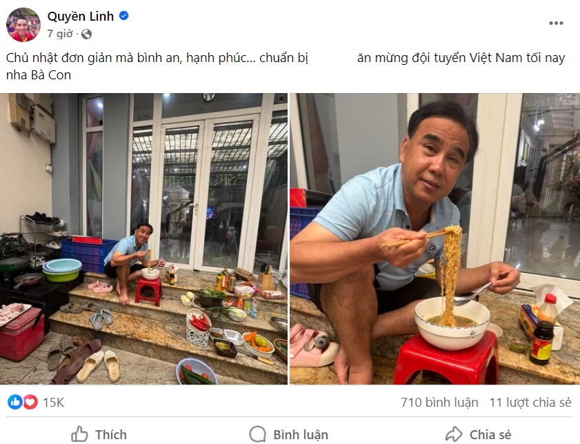 Mới đây, MC Quyền Linh đã gây chú ý khi đăng tải hai bức ảnh chụp lại cảnh anh ngồi ăn mì một mình trước cửa nhà nhân ngày nghỉ cuối tuần. Ngay lập tức CĐM bàn tán rôm rả vì nhận thấy có điều đặc biệt