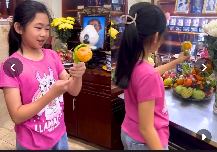 Nhân dịp giỗ mẹ, bé Lavie tự tay đan hoa bằng len để tặng cho mẹ. Khoảnh khắc cô bé dâng hoa lên bàn thờ cố nghệ sĩ khiến nhiều người không khỏi xúc động.