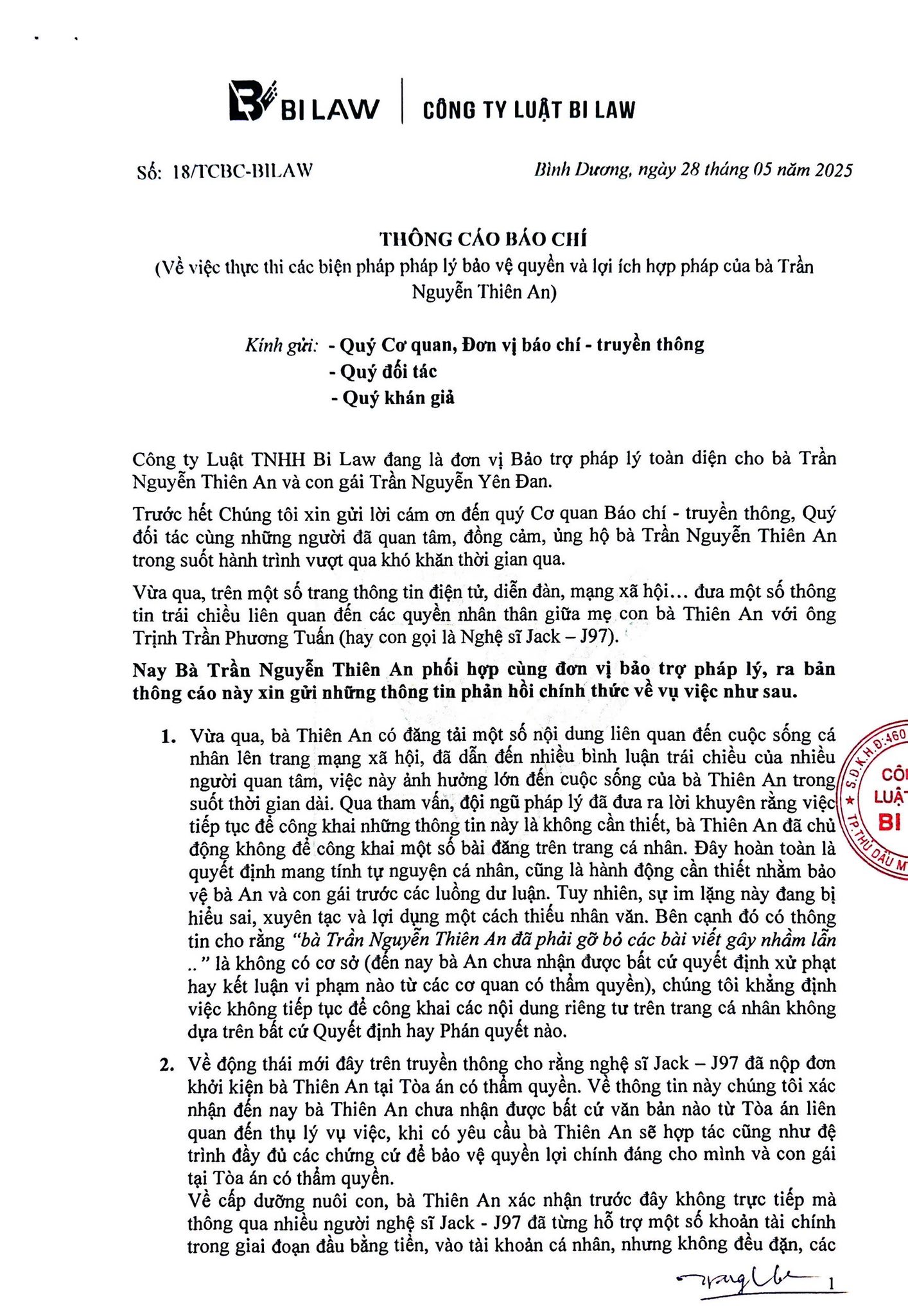 Trong thông cáo nêu rõ vừa qua trên mạng xã hội đưa một số thông tin trái chiều liên quan đến các quyền nhân thân giữa mẹ con Thiên An và Trịnh Trần Phương Tuấn (hay còn gọi là Nghệ sĩ Jack – J97). Từ đó, Thiên An phối hợp với đơn vị bảo trợ pháp lý để chính thức phản hồi về vụ việc, bao gồm: Làm rõ động thái ẩn/xoá bài đăng trên trang cá nhân; Thông tin về việc bị khởi kiện, về việc cấp dưỡng nuôi con của Jack và hướng xử lý các bên truyền thông sai lệch gây ảnh hưởng đến cuộc sống riêng tư.