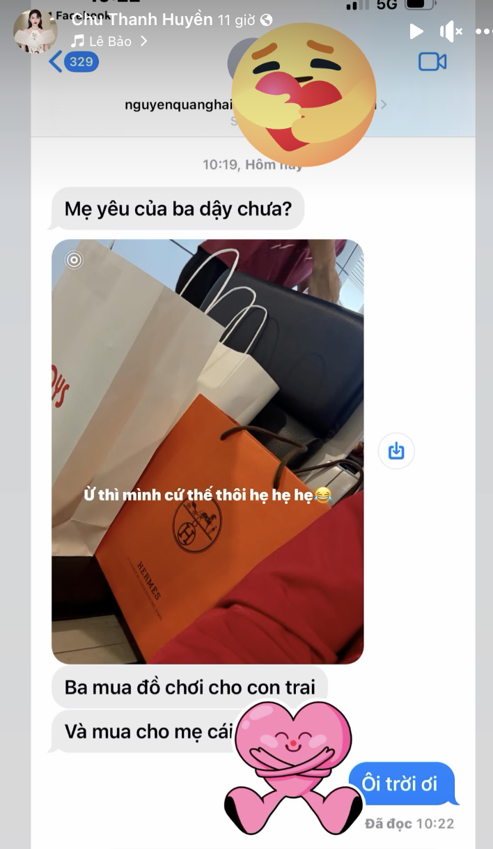 Cụ thể, hot girl Sơn Tây đăng ảnh chụp tin nhắn nhận được từ Quang Hải với lời hỏi thăm ngọt ngào “mẹ yêu của ba dậy chưa”, kèm theo đó là bức ảnh những món đồ hàng hiệu mà Quang Hải đã mua ở sân bay, sắp mang về cho vợ con. Hải “con” tâm tình: “Ba mua đồ chơi cho con trai và mua cho mẹ…”. Dù Chu Thanh Huyền đã dùng icon che đi nội dung về món quà do chồng tặng mình nhưng dân tình dễ dàng nhận ra trong số quà tặng là chiếc túi màu cam nổi bật đến từ thương hiệu đình đám Hermes.